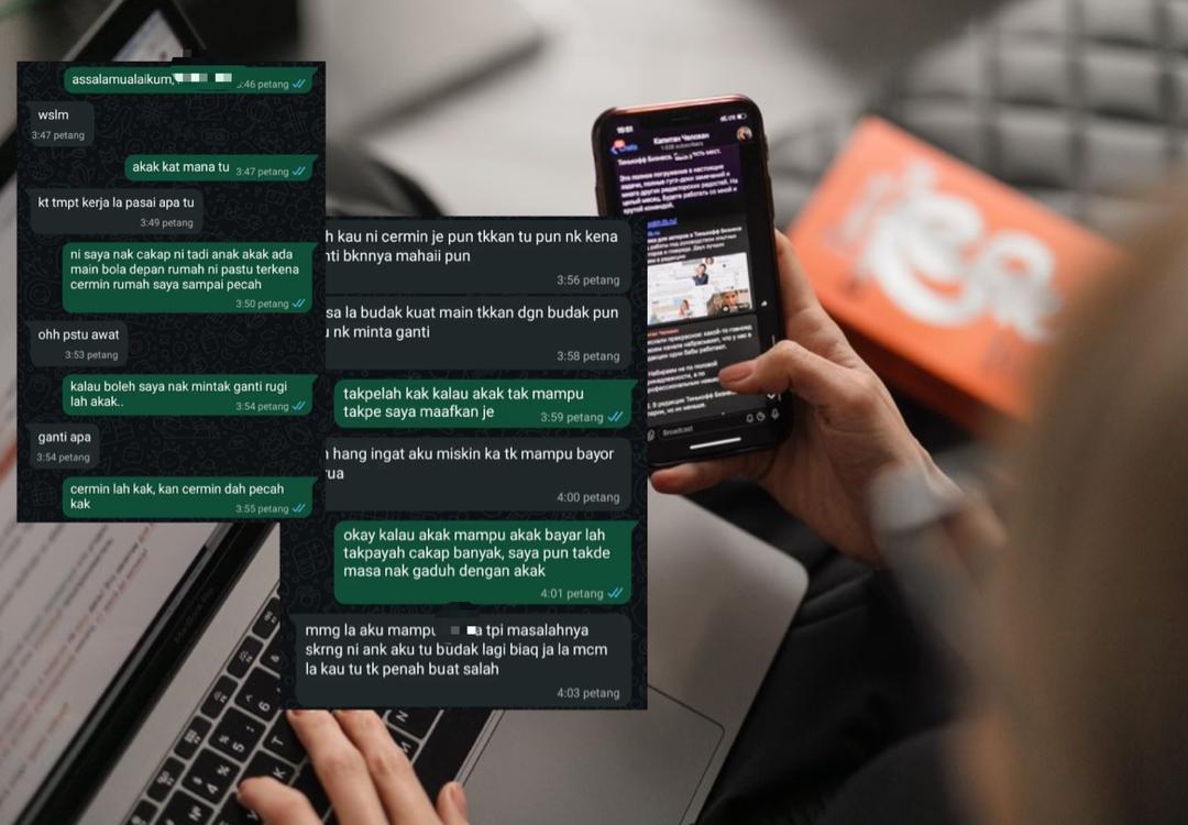 “Saya nak cakap, tadi anak akak ada main bola depan rumah, lepas itu terkena cermin rumah saya sampai pecah. Kalau boleh saya nak minta ganti rugi,” mesej wanita itu kepada ibu kanak-kanak tersebut.