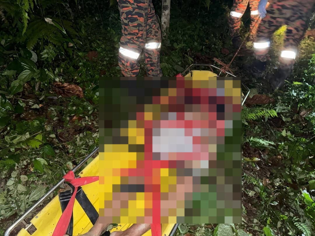 ANGGOTA bomba mengeluarkan seorang lelaki yang cedera apabila sebuah kenderaan pacuan empat roda jenis Ford Ranger terbabas dan jatuh ke dalam gaung sedalam 60 meter dalam kejadian di Batu 13, Jalan Pahang, Tapah pada pukul 11.42 malam semalam. - FOTO IHSAN JBPM PERAK