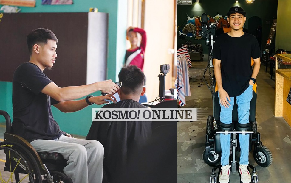 MOHAMAD ARIF yang bergerak menggunakan kerusi roda akibat kemalangan pada 2017 turut mengambil upah menggunting rambut pada hujung minggu.