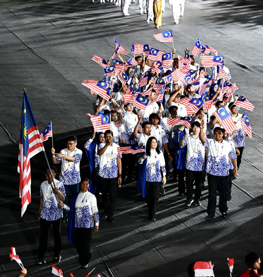 Di sebalik kemegahan persembahan tuan rumah, kontinjen Malaysia turut mencuri tumpuan di stadium apabila tampil segak dan penuh karakter ketika perarakan masuk kontinjen.
