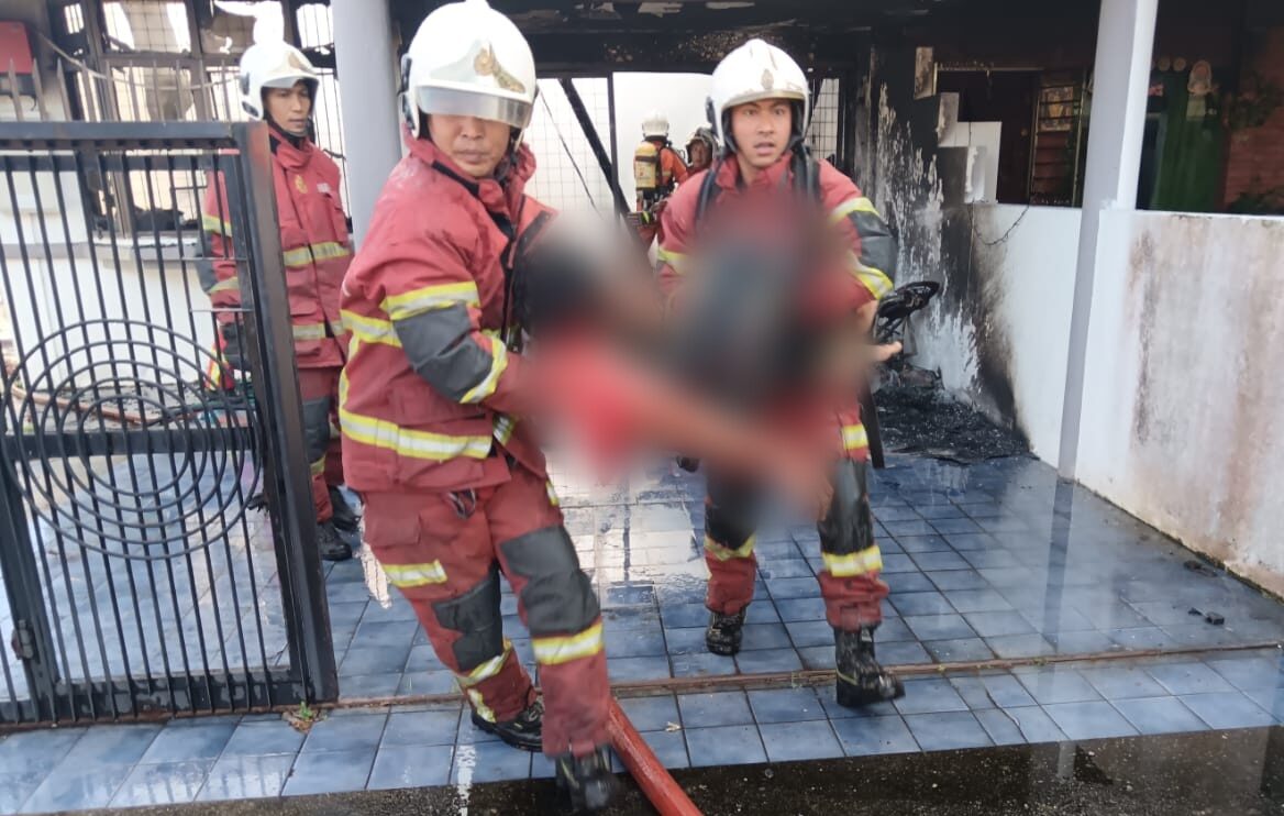 Anggota bomba membantu membawa keluar mangsa yang terperangkap dalam kebakaran di Taman Air Tawar, Butterworth, pagi tadi. Foto JBPM
