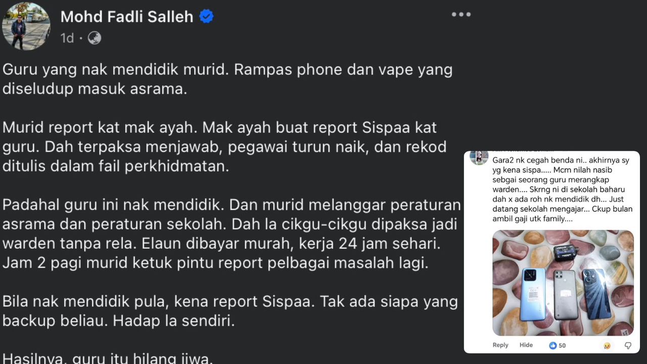 “Gara-gara nak cegah benda ni, akhirnya saya yang kena SISPAA. Sekarang di sekolah baharu, sudah hilang roh nak mendidik. Datang mengajar saja, cukup bulan ambil gaji,” tulis guru tersebut.