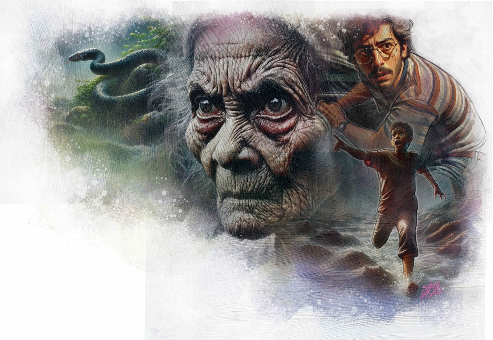 ISMAIL melihat kelibat seorang nenek tua sedang mengelilingi pokok besar berhampiran kawasan air terjun yang menjadi tempat mereka sekeluarga berkelah sebelum itu.– Ilustrasi Shah hasan