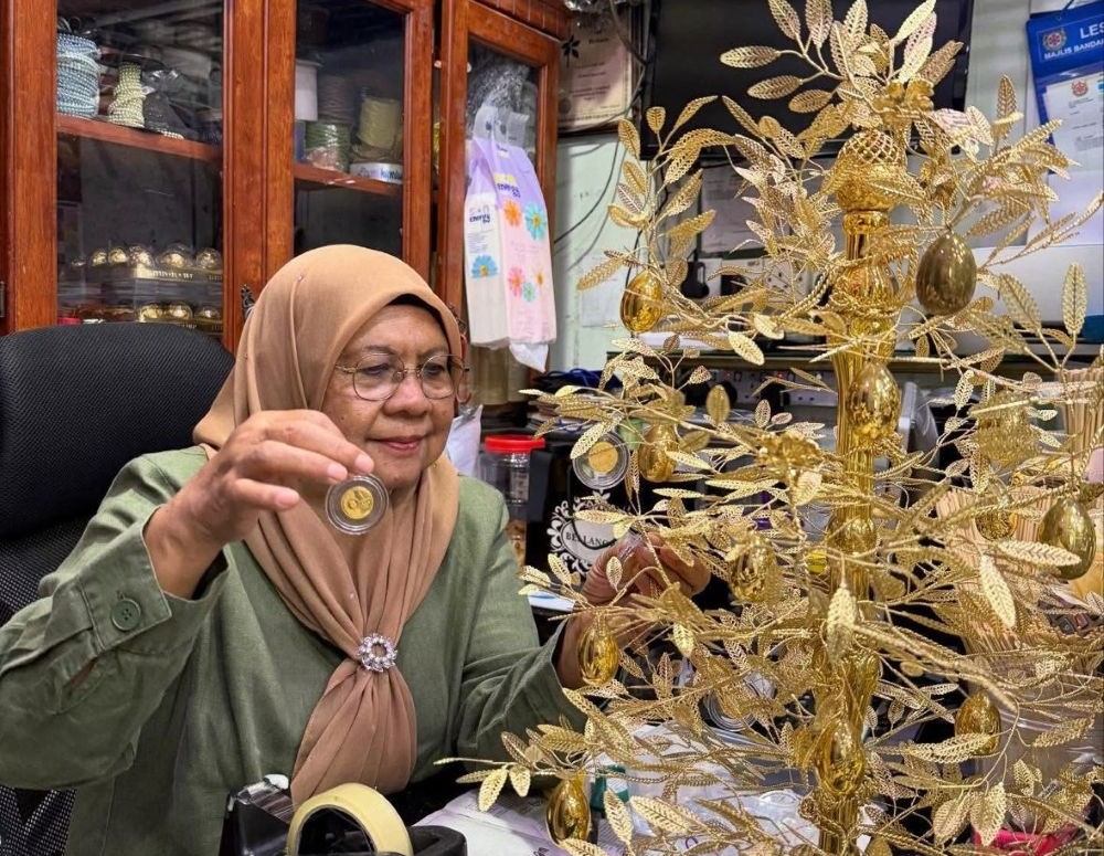 Siti Morni ketika menyiapkan pokok ufti emas yang digubahnya untuk pasangan popular Mr. E dan Erra Fazira.