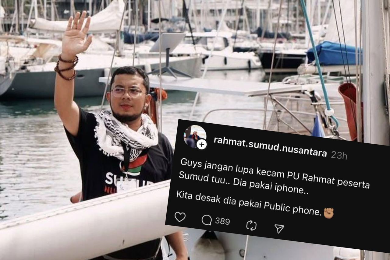 “Guys jangan lupa kecam PU Rahmat peserta Sumud tu. Dia pakai iPhone, kita desak dia pakai public phone,” katanya dalam nada gurauan.