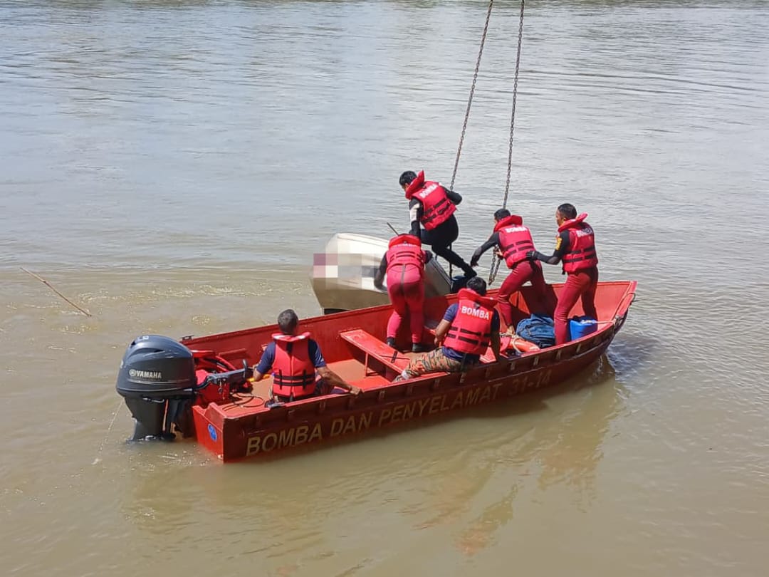 Anggota bomba menjalankan operasi menarik keluar kereta Proton Waja yang terjatuh ke dalam Sungai Perak di Kampung Baru Layang-layang Kanan, Parit hari ini.