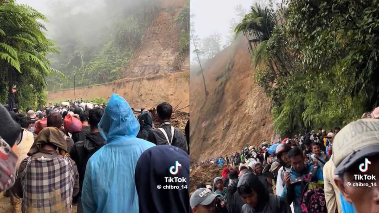 Rakaman video dimuat naik di platform TikTok oleh akaun @chibro_14 menunjukkan lautan manusia berjalan beramai-ramai di sepanjang laluan sebuah gunung yang dipenuhi lumpur dan tanah.