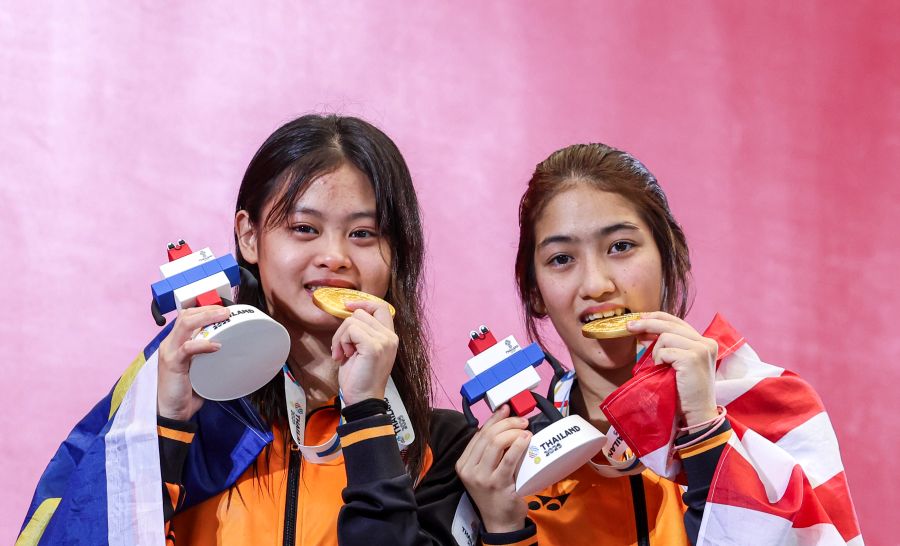 EILISHA (kanan) dan Farisaya menjuarai pingat emas platform seirama wanita Sukan SEA 2025 di Pusat Akuatik Universiti Suvarnabhumi kelmarin.