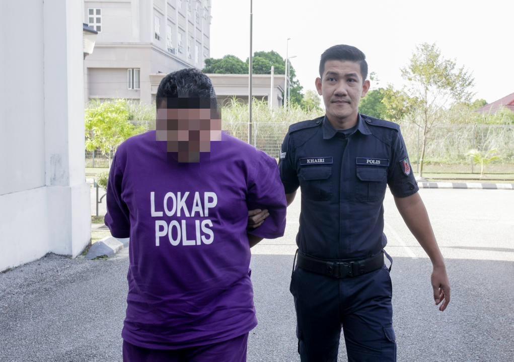 Anggota polis membawa tertuduh untuk didakwa atas pertuduhan melakukan sumbang mahram dengan adiknya di Mahkamah Sesyen Kota Bharu hari ini. Foto oleh KAMARUL BISMI KAMARUZAMAN / KOSMO!