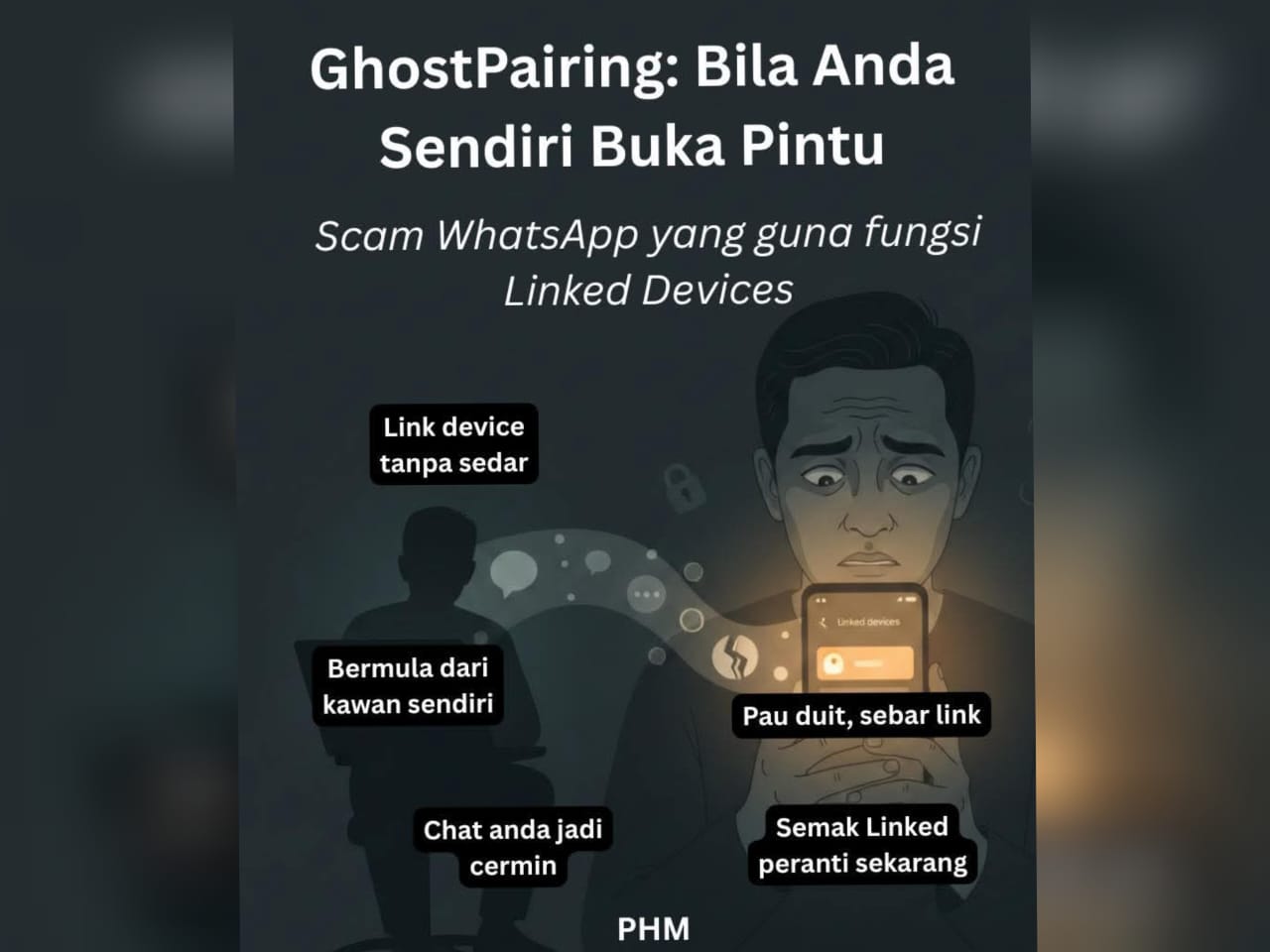 Tanpa disedari, mangsa sebenarnya sedang menghubungkan akaun WhatsApp mereka ke peranti ‘scammer’ melalui fungsi ‘Linked Devices’, sekali gus membenarkan peranti asing itu menerima salinan perbualan secara langsung.