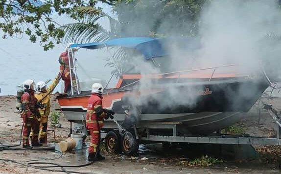 “Berdasarkan maklumat awal yang diterima, bot yang sudah lama parkir di darat terbakar semasa proses memasang bateri. Berlaku percikan api dan menyambar lebihan minyak yang berada berdekatan.