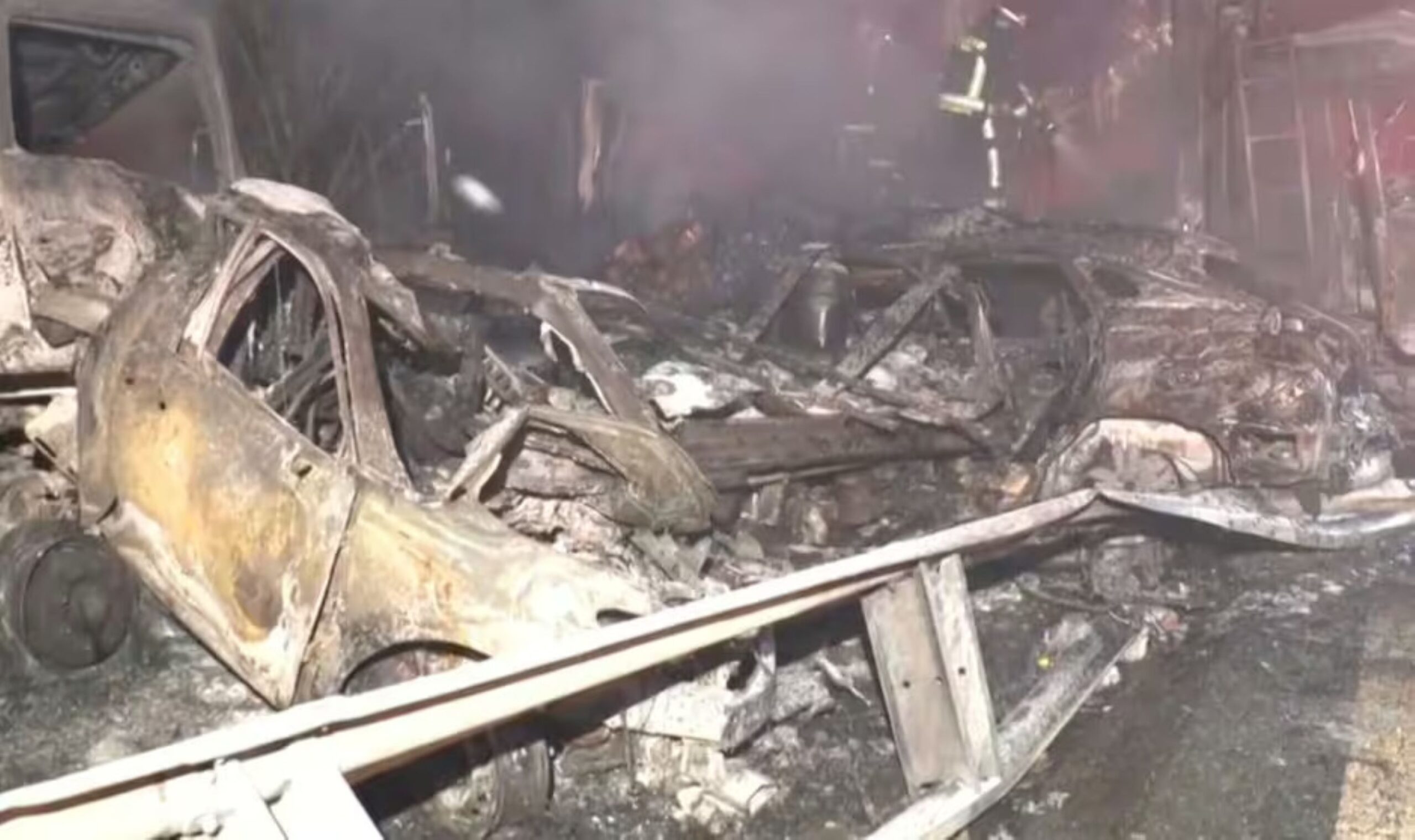 SEBAHAGIAN kenderaan hangus terbakar. - Foto BBC