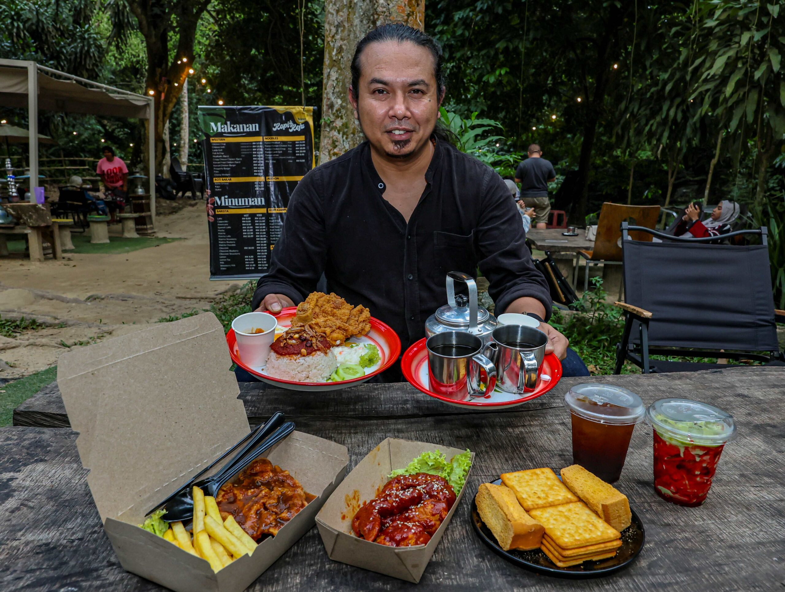 PESONA alam semula jadi dengan iringan bunyi kicauan burung dan deruan air sungai membuatkan suasana kedai makan Kopi & Keju terasa nyaman serta tenang.