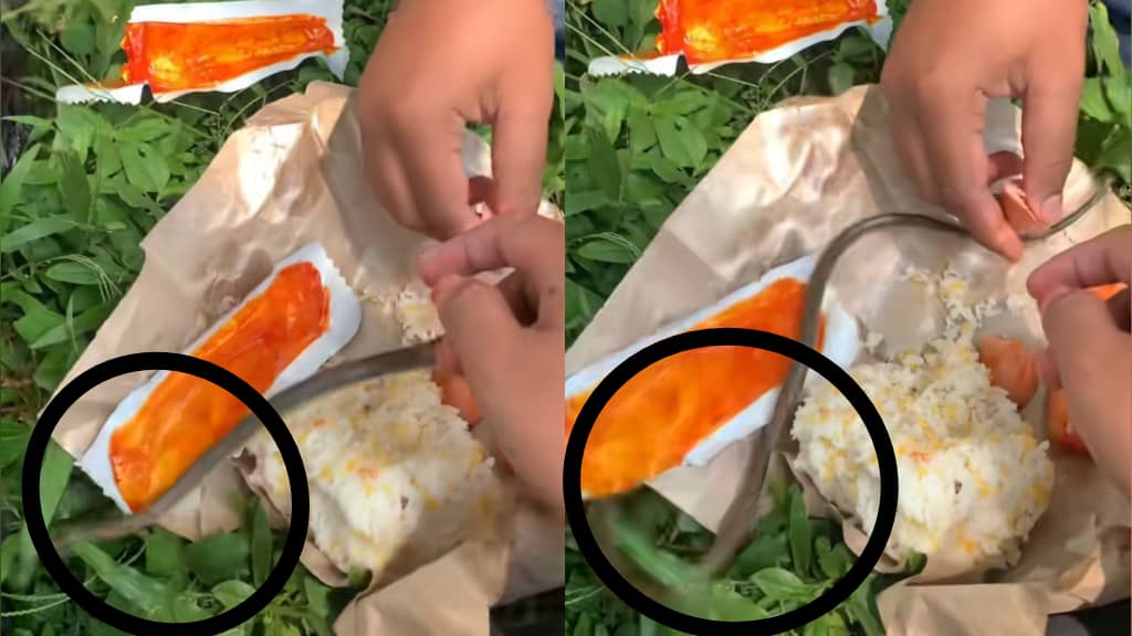 Menerusi hantaran pengguna TikTok @Kembangkol000, kelihatan beberapa individu sedang menikmati makanan bersama keluarga sebelum ular tersebut melalui bungkusan makanan itu.