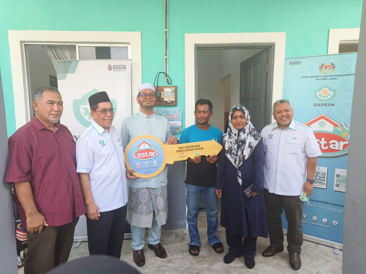 Zulkifli (tiga dari kiri) menyerahkan replika kunci rumah kepada salah seorang penerima pada Sesi Penyerahan Sinar Lestari YaPEIM di Kampung Aman, Kandis dekat Bachok hari ini.