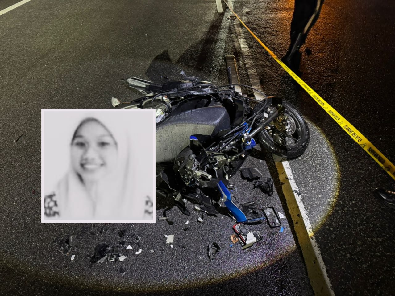KEADAAN motosikal Intan Darwiena yang terlibat dalam kemalangan di Kilometer 67.4 Lebuhraya Senai - Desaru, Kota Tingg malam semalam. Foto IHSAN PDRM