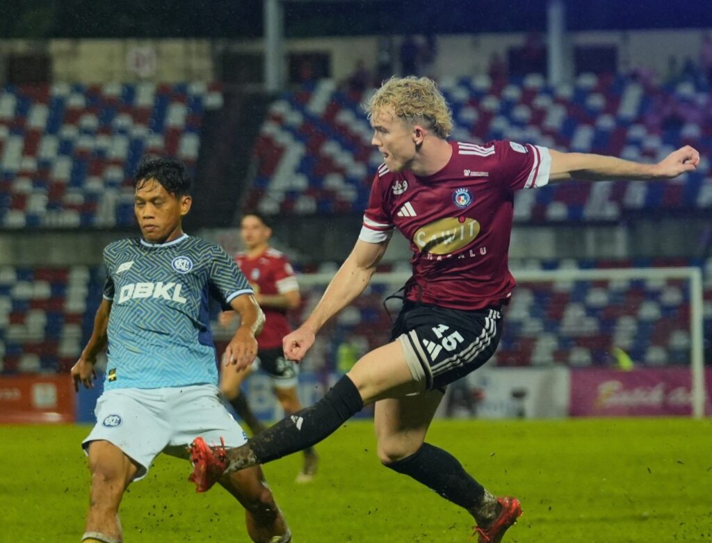 Penyerang Sabah FC, Fergus Tierney melakukan rembatan ke gawang KL City pada aksi Liga Super hari ini. – Foto ihsan MFL