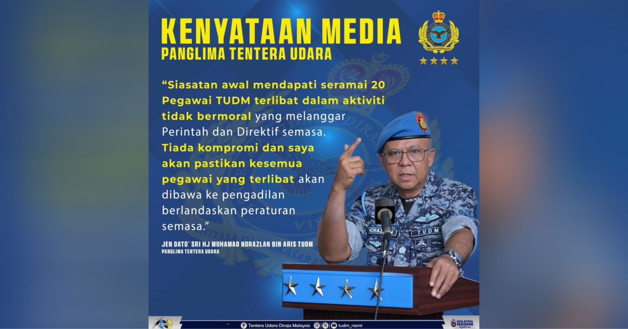 PETALING JAYA – Seramai 20 pegawai Tentera Udara Diraja Malaysia (TUDM) didapati terlibat secara langsung dalam aktiviti tidak bermoral.