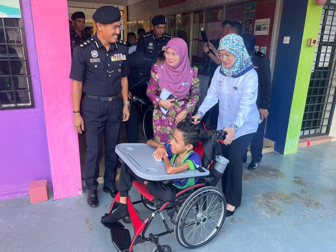 Rusmini (kanan) menyantuni pelajar Program Pendidikan Khas Integrasi (PPKI) di SMK Dato Ali Ahmad di Kangar, hari ini.