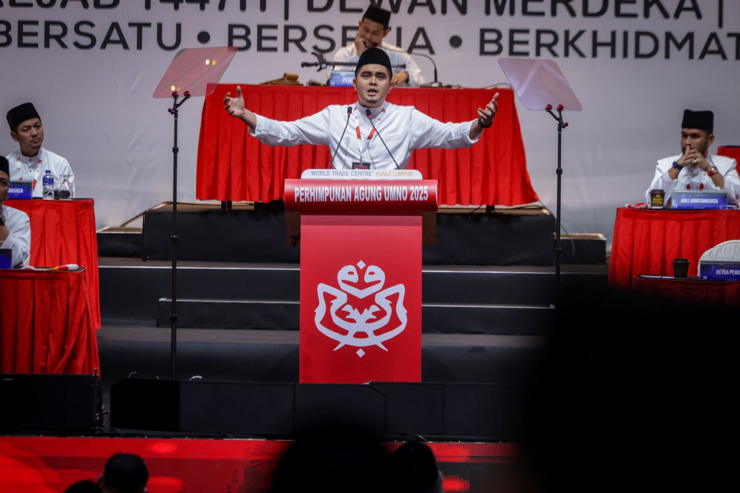 Dr. Muhamad Akmal menyampaikan ucapan pada Majlis Ucapan Dasar Ketua Pergerakan Pemuda UMNO sempena Perhimpunan Agung UMNO 2025 di WTC, hari ini. Foto oleh MUHAMAD IQBAL ROSLI / KOSMO!
