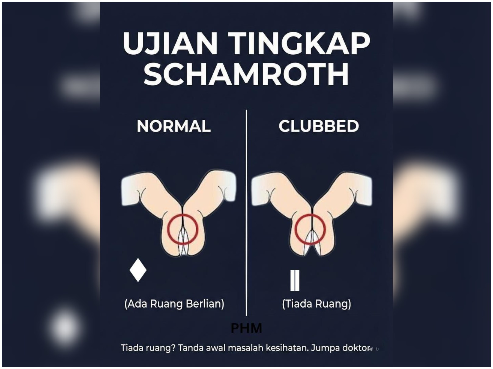 “Rapatkan kuku jari telunjuk kiri dan kanan, tengok delah pertemuan kuku. Jika ada lubang kecil berbentuk ‘diamond’ jari anda normal. Namun, jika tiada lubang, ini bermakna hujung jari telah membengkak dan kuku melengkung ke bawah petanda jari tabuh,” menurut PHM.