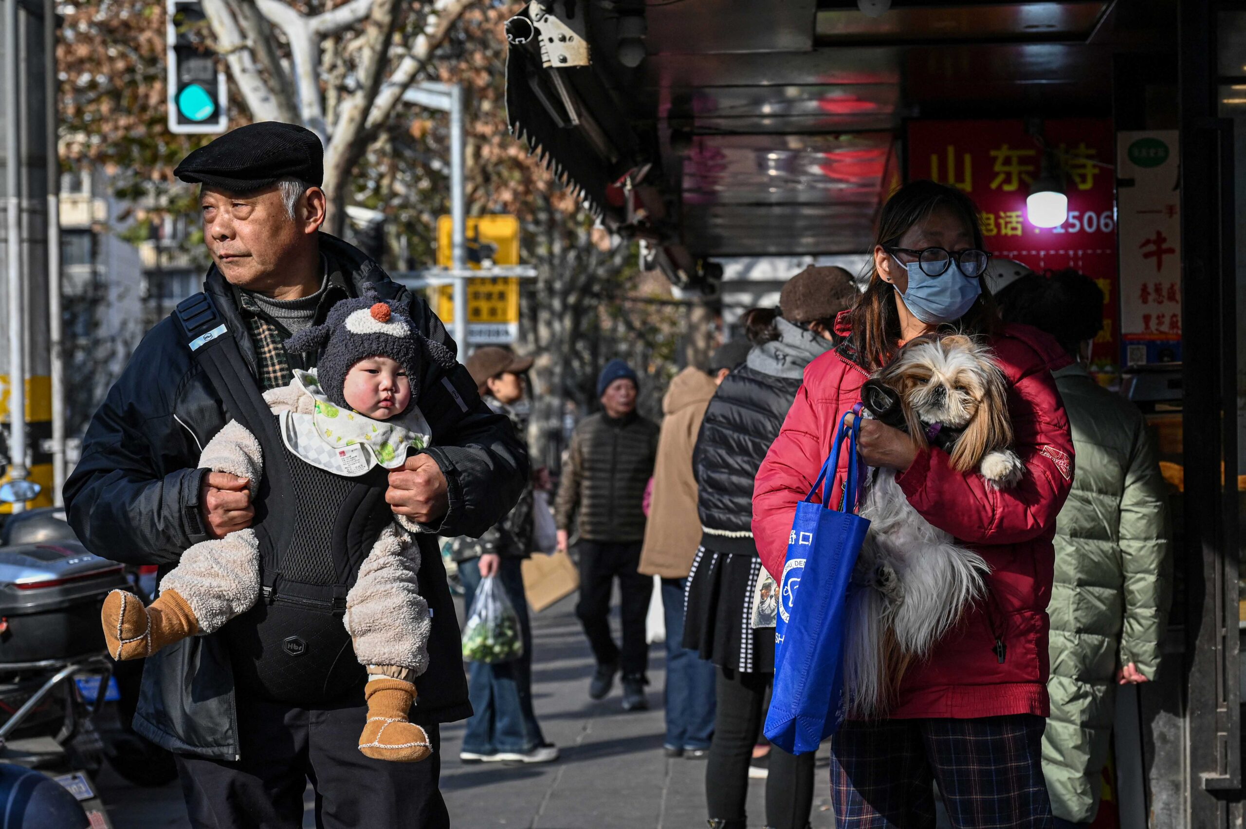 WARGA emas mendukung bayi di samping seorang wanita yang membawa seekor anjing di sebatang jalan di Shanghai pada 9 Januari lepas. – AFP