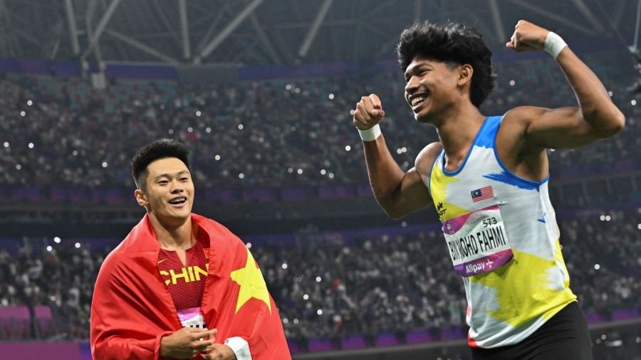AZEEM (kanan) menunjukkan reaksi bangga selepas meraih pingat gangsa acara 100m Sukan Asia Hangzhou dengan catatan masa 10.11s pada September 2023- AFP