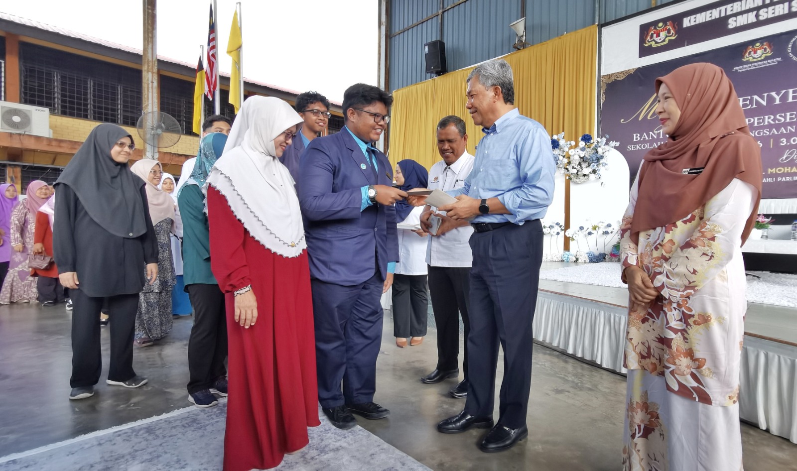 SEREMBAN, 26 JANUARI 2026 - Mohamad Hasan, menyampaikan sumbangan pada para pelajar di Majlis Penyerahan Bantuan Awal Persekolahan SMK Seri Sendayan, hari ini. - Foto oleh MOHD SHAHJEHAN MAAMIN