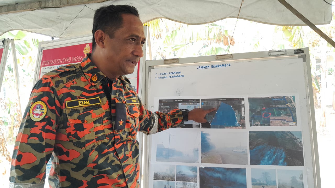 EZAM memberi penerangan tentang operasi pemadam api kebakaran tanah gambut yang akan dijalankan ketika ditemui di markas bomba di Taman Bayu Damai, Pengerang, Kota Tinggi hari ini. Foto MASTURAH SURADI/ KOSMO!
