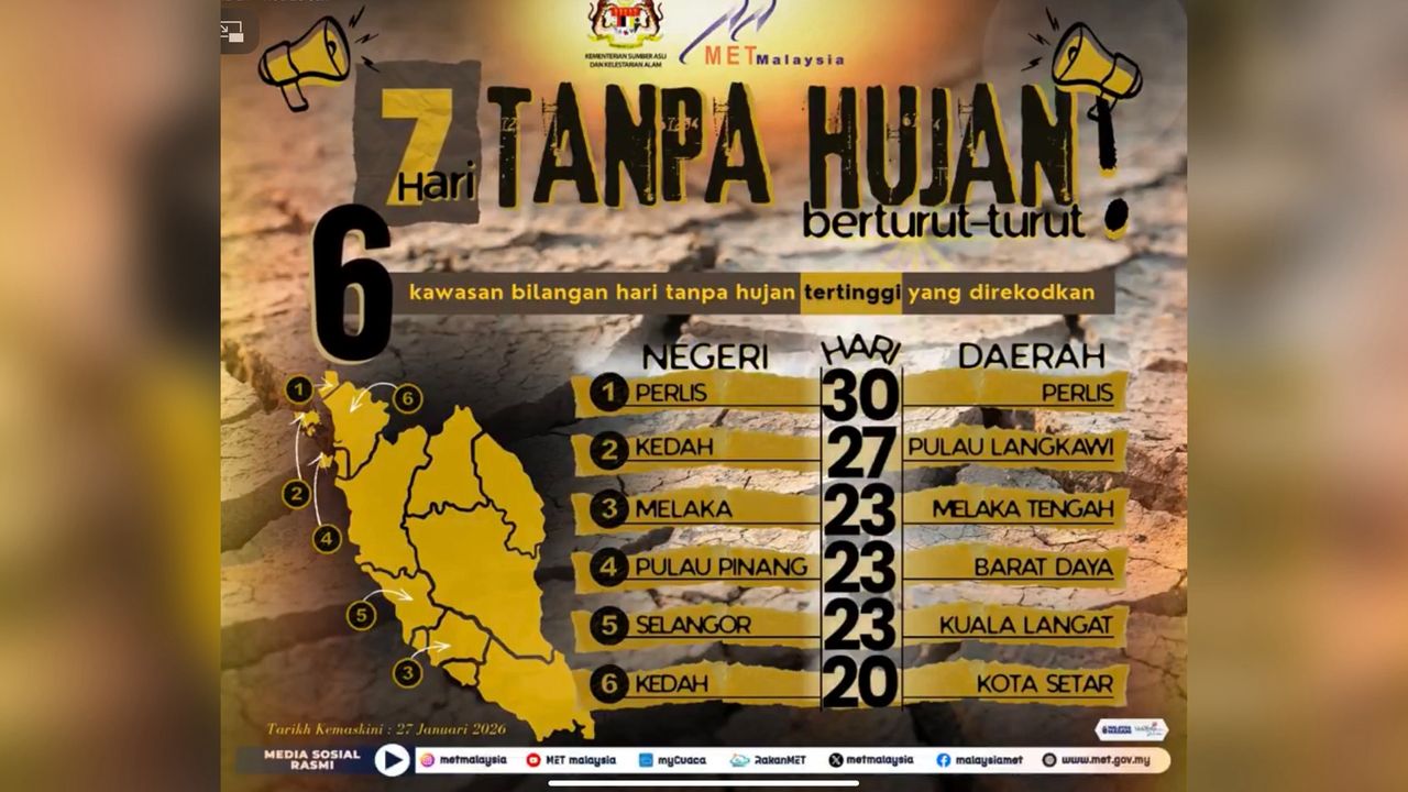 “Turut terlibat, Selangor yang turut merekodkan 23 hari di Kuala Langat, manakala Kedah di Kota Setar mencatatkan 20 hari,” menurut MetMalaysia.