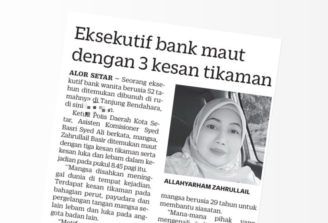Menurut Norsiah, dia sekeluarga mengetahui kejadian yang menimpa Zahrullail yang juga eksekutif bank selepas anak mangsa menghubungi suaminya, Basir Kosop pada pukul 9 pagi tadi.