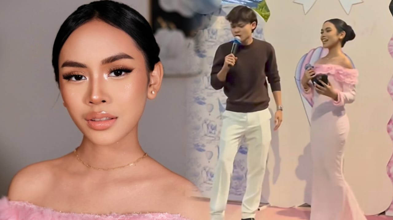 Persalinan merah jambu itu dikenakan pada majlis ‘gender reveal’ kandungan ibu tirinya, Watie Hanifiah yang berlangsung di sebuah gelanggang acara di Gombak, kelmarin.
