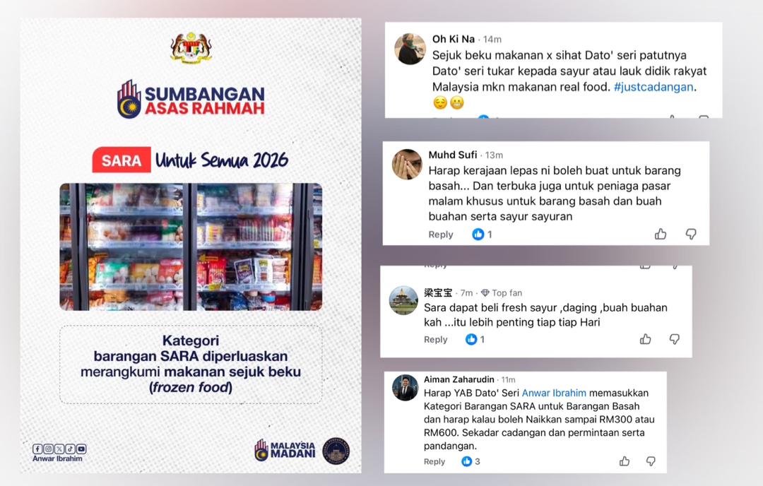 PETALING JAYA – Ramai rakyat merayu Kerajaan Madani dan Perdana Menteri, Datuk Seri Anwar Ibrahim supaya mempertimbang peluasan barangan keperluan asas seperti ayam, daging, sayur dan buah-buahan segar dimasukkan dalam program Sumbangan Asas Rahmah (Sara).