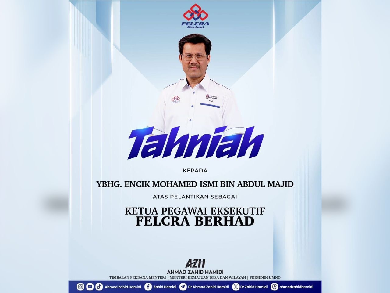 KUALA LUMPUR – Timbalan Perdana Menteri, Datuk Seri Dr Ahmad Zahid Hamidi merakamkan ucapan tahniah kepada Mohamed Ismi Abdul Majid atas pelantikan beliau sebagai Ketua Pegawai Eksekutif (CEO) Felcra Berhad yang baharu.