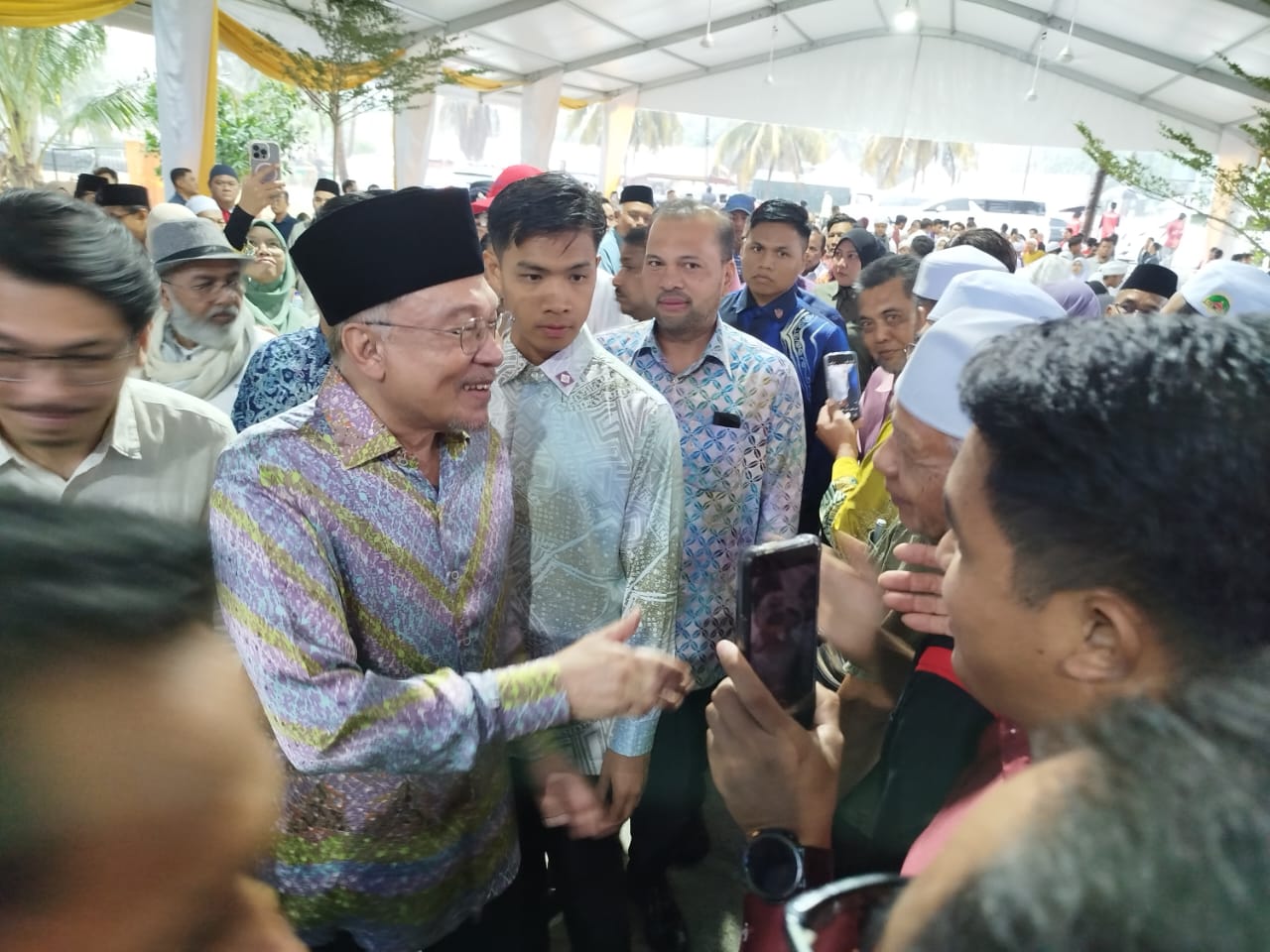 ANWAR bermesra dengan rakyat yang turut menghadiri Majlis Santuni Madani dan Sambutan Ihya Ramadan warga Padang Rengas bersama Perdana Menteri di Padang Rengas hari ini.