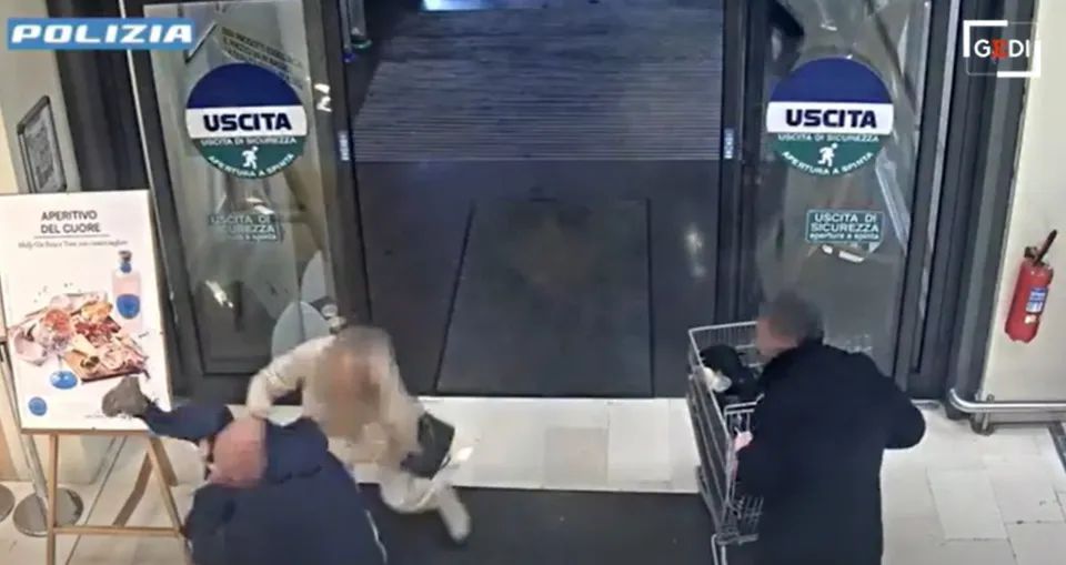Tangkap layar video menunjukkan suspek cuba menculik seorang gadis di dalam sebuah pasar raya di Itali. - Polis Bergamo