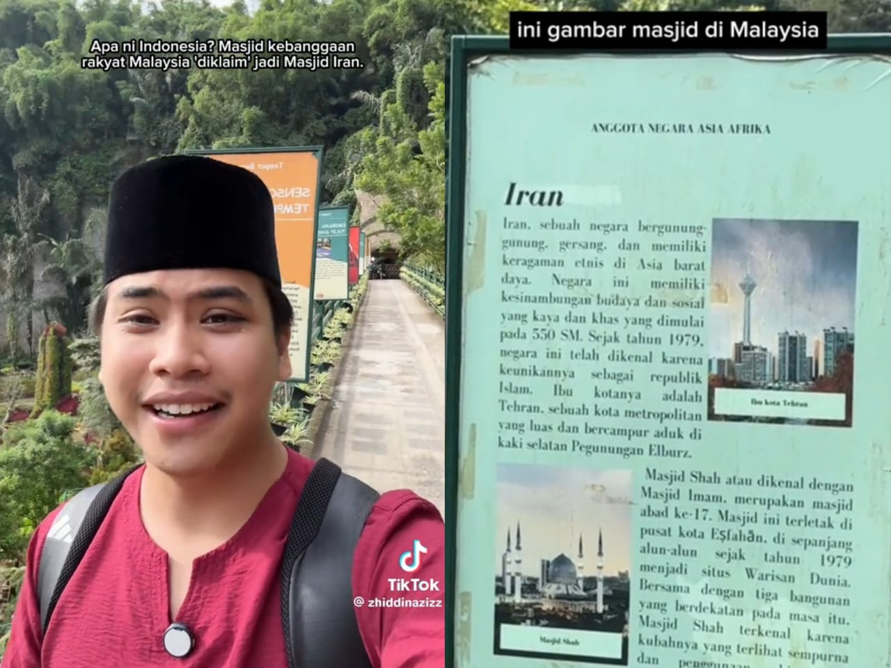 Tangkap layar video TikTok Zhiddin Aziz berhubung gambar Masjid Sultan Salahuddin Abdul Aziz Shah di Shah Alam, Selangor yang dikatakan sebagai masjid di Iran, pada papan tanda informasi tempat tarikan di Indonesia.