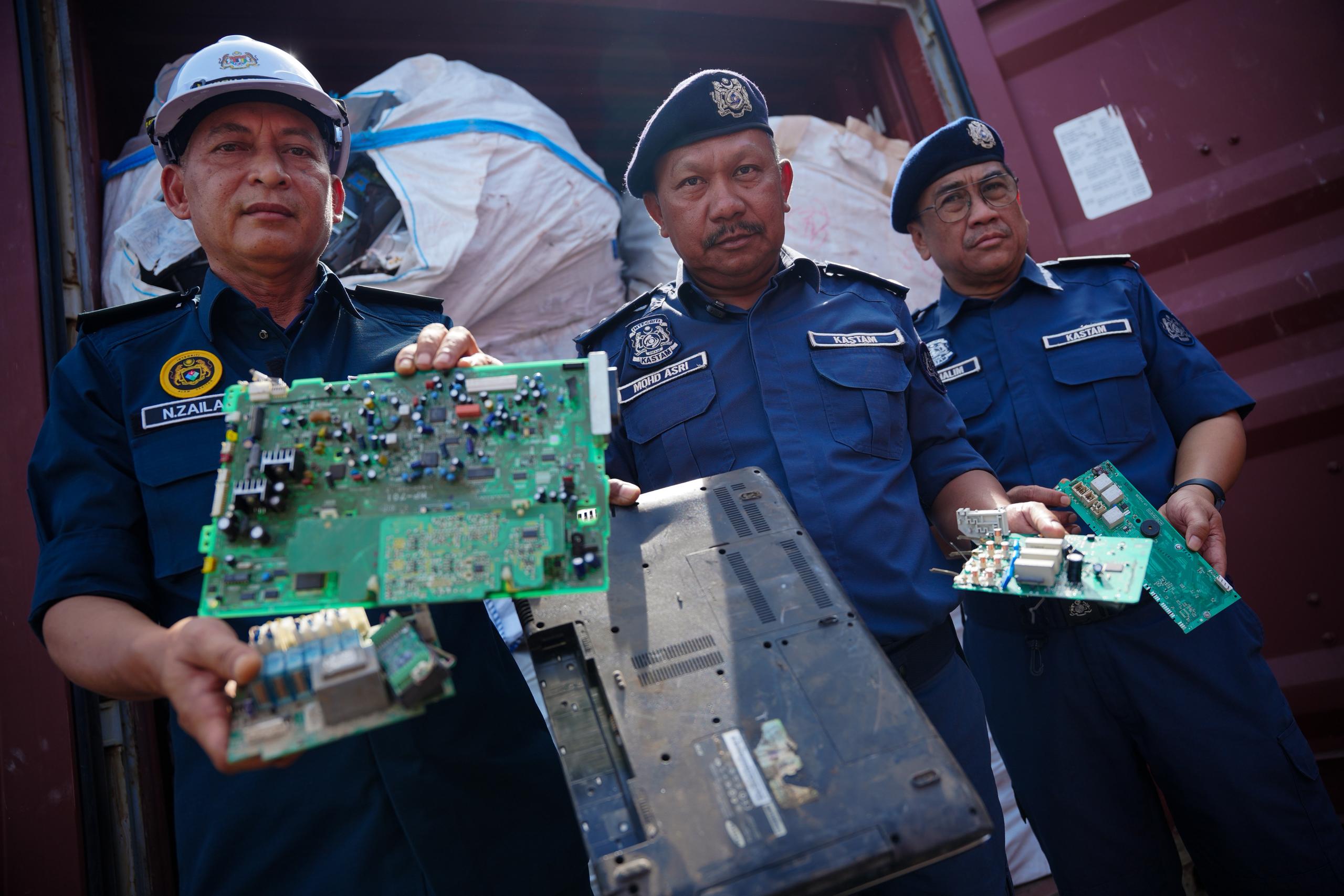Mohd. Asri (tengah) menunjukkan komponen e-waste yang dirampas dalam lapan kontena di Pelabuhan Utara. Foto oleh SADDAM YUSOFF / KOSMO!