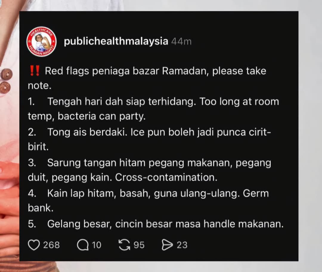 “Kalau tengah hari makanan dah siap terhidang, itu tanda ia dah lama terdedah suhu bilik. Bila lama sangat, bakteria mudah membiak dan makanan yang nampak elok boleh jadi punca cirit-birit malam nanti,” pesan PHM di media sosial.