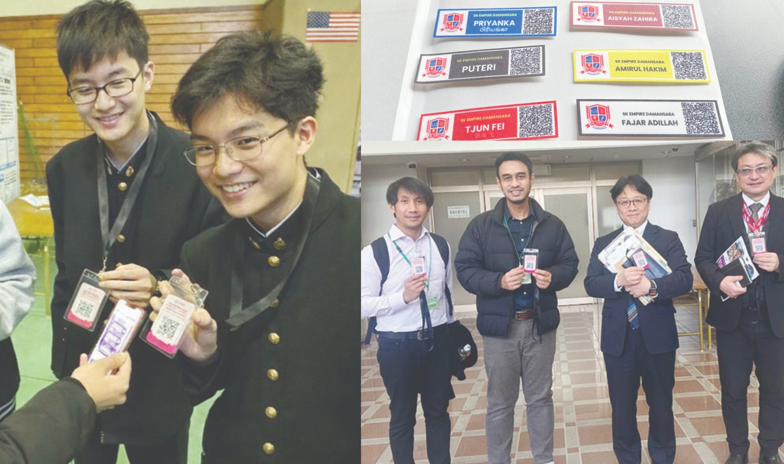 SEBAHAGIAN pelajar di salah sebuah sekolah di Osaka menunjukkan StudentQR yang digunakan mereka (kiri). Syed Huzaifah (dua dari kiri) bersama kakitangan sekolah di Osaka (kanan).