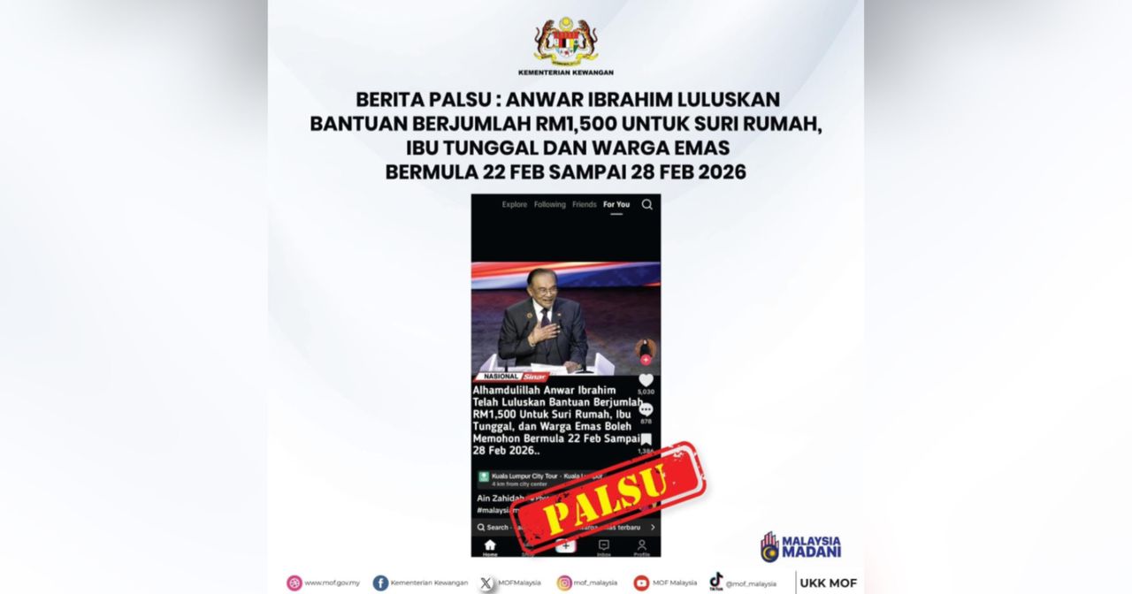 “Tular di media sosial dakwaan bahawa Perdana Menteri meluluskan bantuan RM1,500 kepada suri rumah, ibu tunggal dan warga emas bermula 22 hingga 28 Februari 2026.