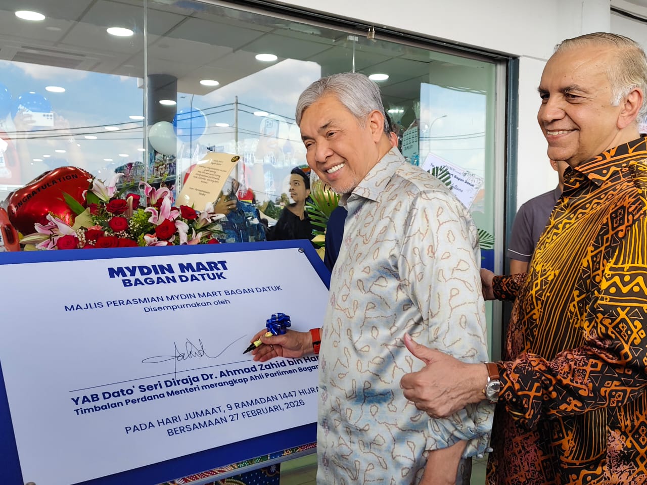 AHMAD Zahid (kiri) menandatangi plak sebagai simbolik perasmian Mydin Mart Bagan Datuk hari ini.