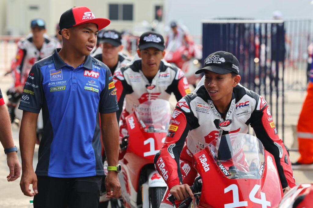 Hakim Danish (kiri) sempat bertemu pelumba negara yang bersaing di Moto4 Asia Cup.
