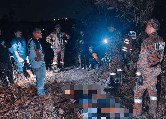 Pasukan bomba menjalankan operasi bagi mengeluarkan Seorang lelaki yang maut selepas dipercayai terjatuh dari pokok ketika menjalankan aktiviti berburu di kawasan hutan Sapoda, Kota Belud malam tadi. Foto JBPM