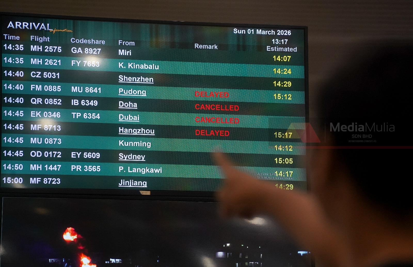Paparan jadual penerbangan ke rantau Asia Barat dibatalkan berikutan penutupan ruang udara susulan serangan Amerika Syarikat dan Israel ke atas Iran. Foto FAISOL MUSTAFA/KOSMO!