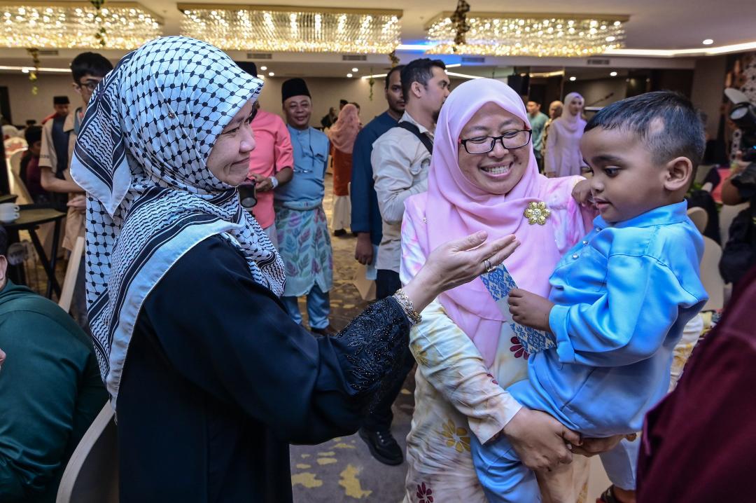 Fadhlina (kiri) ketika memberikan duit raya kepada kanak-kanak pada Majlis Pra Pelancaran Pesta Buku Antarabangsa Kuala Lumpur dan Majlis Berbuka Puasa di Ideas Hotel Kuala Lumpur hari ini. Foto oleh SYAKIR RADIN/KOSMO!