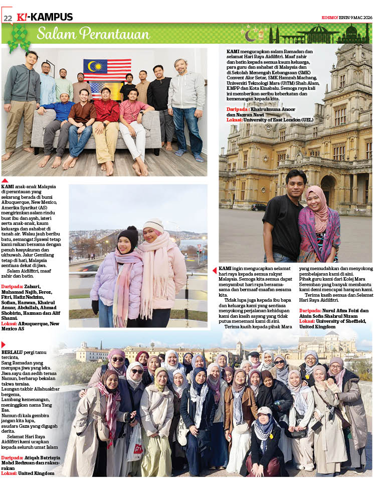 KAMI mengucapkan salam Ramadan dan selamat Hari Raya Aidilfitri. Maaf zahir dan batin kepada semua kaum keluarga, para guru dan sahabat di Malaysia dan di Sekolah Menengah Kebangsaan (SMK) Convent Alor Setar, SMK Hamzah Machang, Universiti Teknologi Mara (UiTM) Shah Alam, KMPP dan Kota Kinabalu. Semoga raya kali ini memberikan seribu keberkatan dan kemenangan kepada kita.