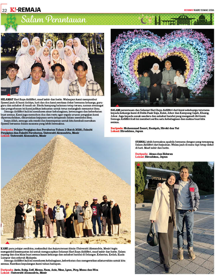 SELAMAT Hari Raya Aidilfitri, maaf zahir dan batin. Walaupun kami menyambut Syawal jauh di bumi Anbiya, hati dan doa kami sentiasa dekat bersama keluarga, guru-guru dan sahabat di tanah air. Rindu kampung halaman tetap terasa, namun semangat dan pengorbanan ini kami jadikan kekuatan untuk terus melangkah menuntut ilmu.