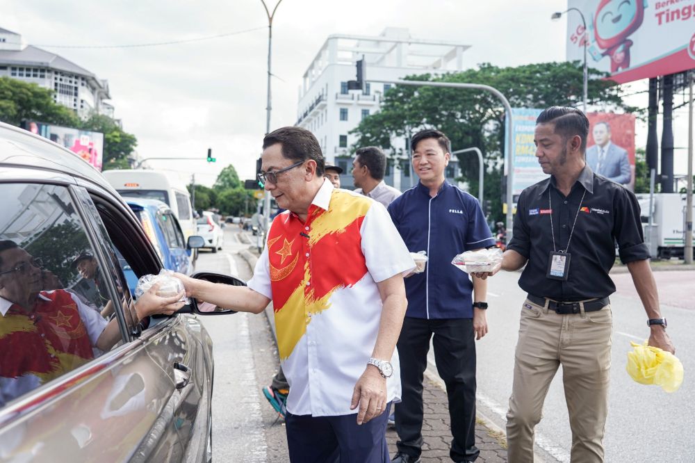 Mohd. Kamri turun padang menyerahkan pek bubur lambuk kepada pengguna jalan raya di hadapan bilik pameran Fella Design Ampang.