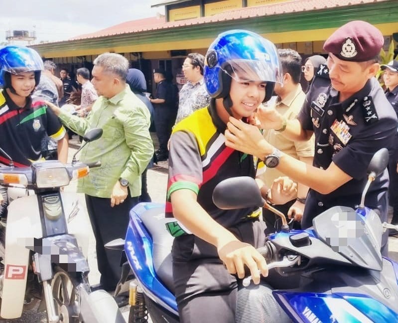 Mohd. Khairi (kanan) memakaian topi keledar baharu kepada salah seorang penunggang motosikal pada Kempen dan Advokasi Keselamatan Jalan Raya di Kemaman hari ini.